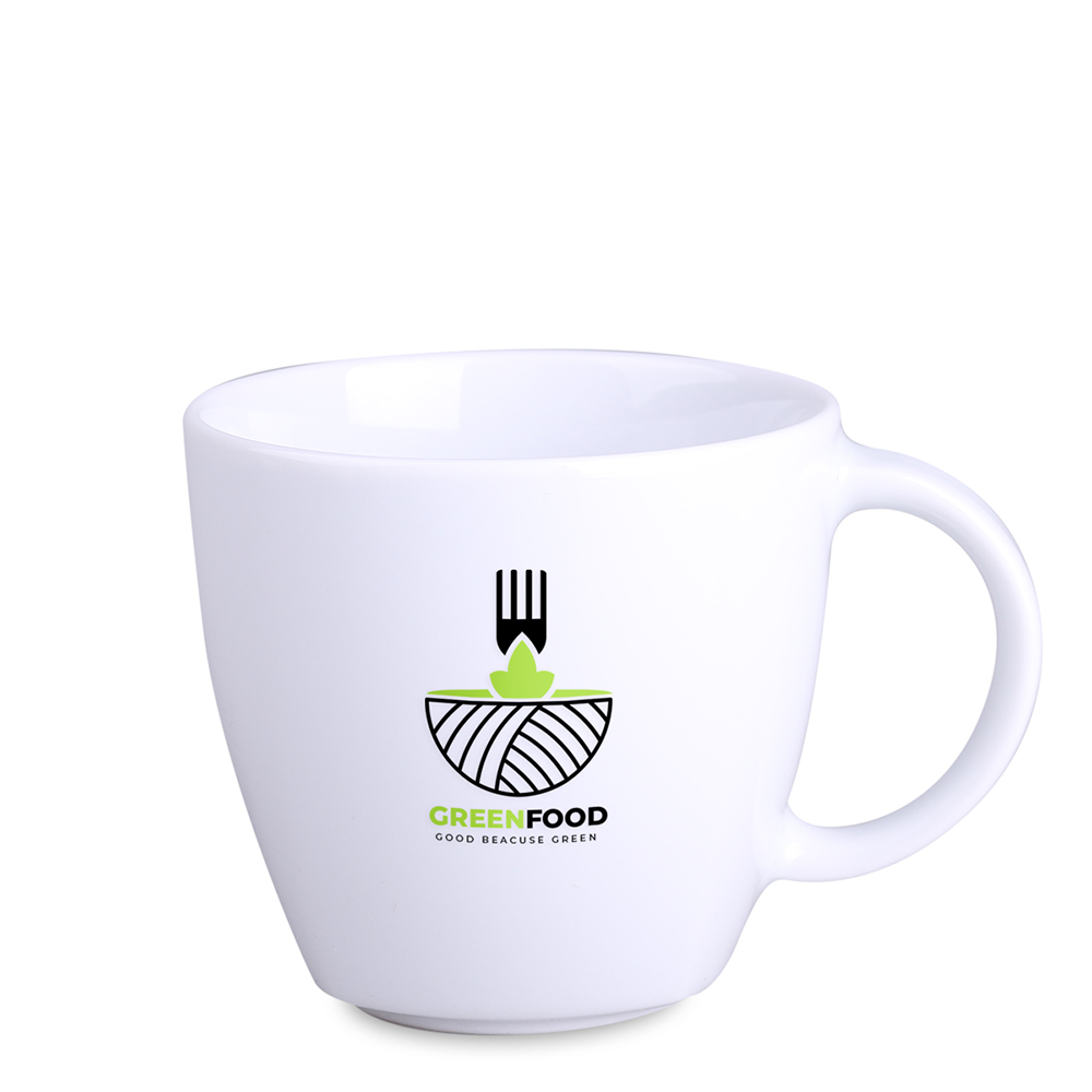 A porcelain advertising mug available in two sizes. This design features delicate edges visible in the lower part.