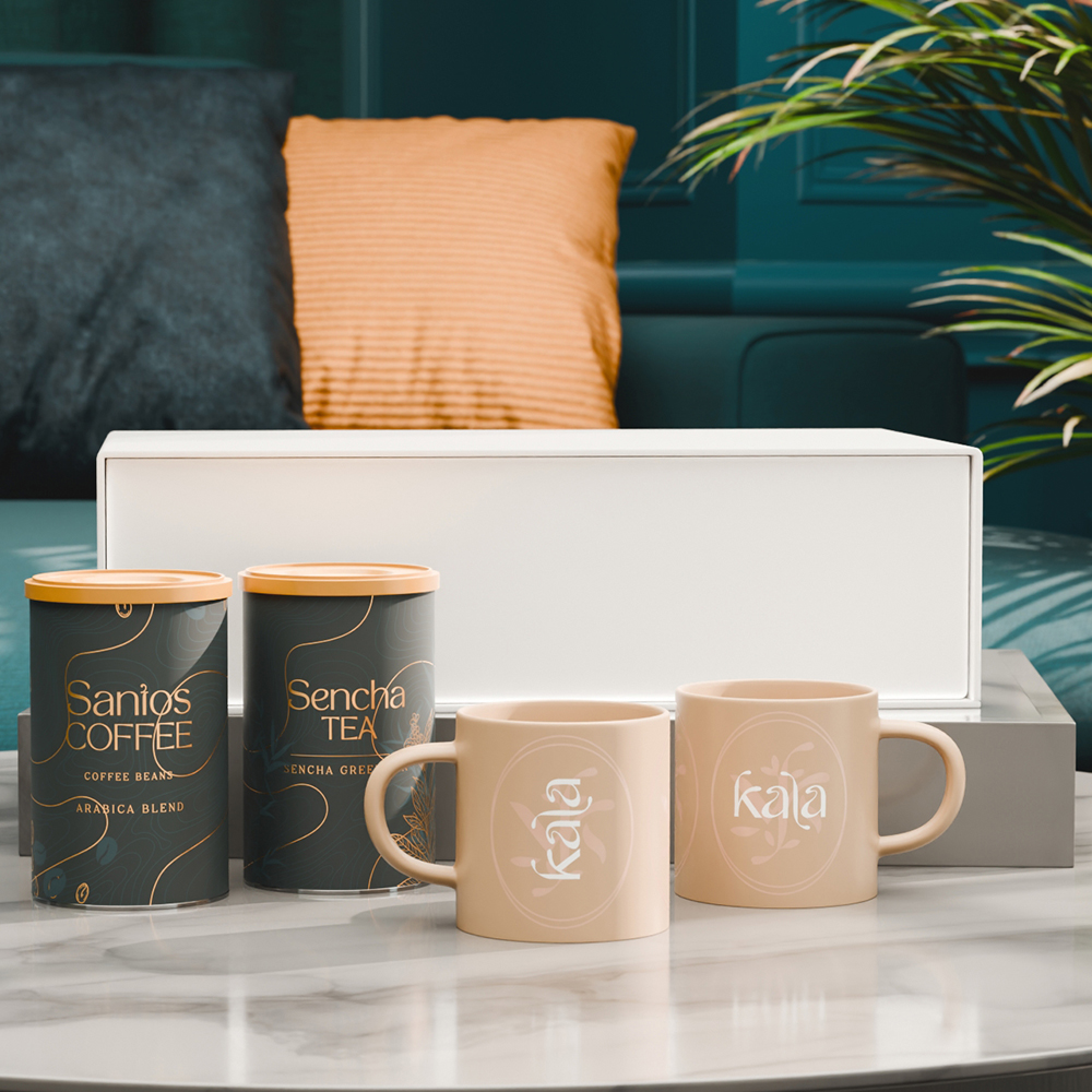 A subtle duo of two Gaia mugs with balanced, natural colouring, ideal for highlighting a commitment to ethics and ecology. The set is complemented by selected "Santos Coffee" and aromatic "Sencha Tea" in elegant tins. The whole is packed in an exclusive, snow-white box with a magnetic closure.